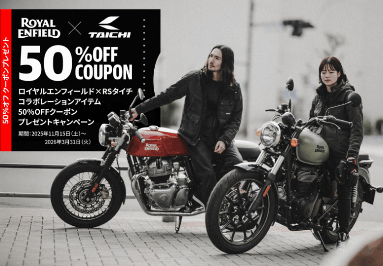 【 ロイヤルエンフィールド × RSタイチ コラボレーションアイテム 50%OFFクーポン プレゼントキャンペーン 】マジでお得なキャンペーン。