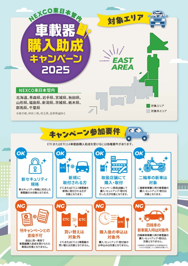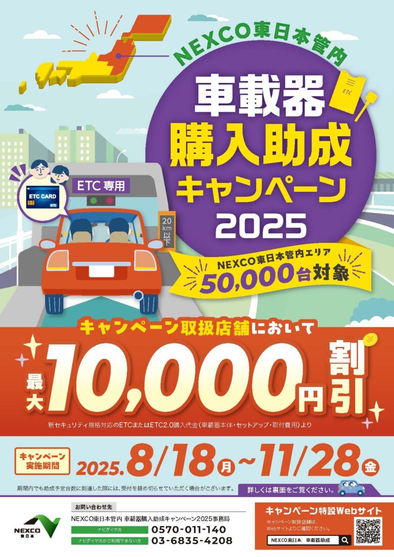 ETCの普及促進を目的に、車載器の取り付け費用等から対象車1台につき、最大10,000円を助成する「NEXCO東日本管内・ETC車載器購入助成キャンペーン2025」が8月18日からスタートしてましたが、いよいよ11月28日で終了となります。