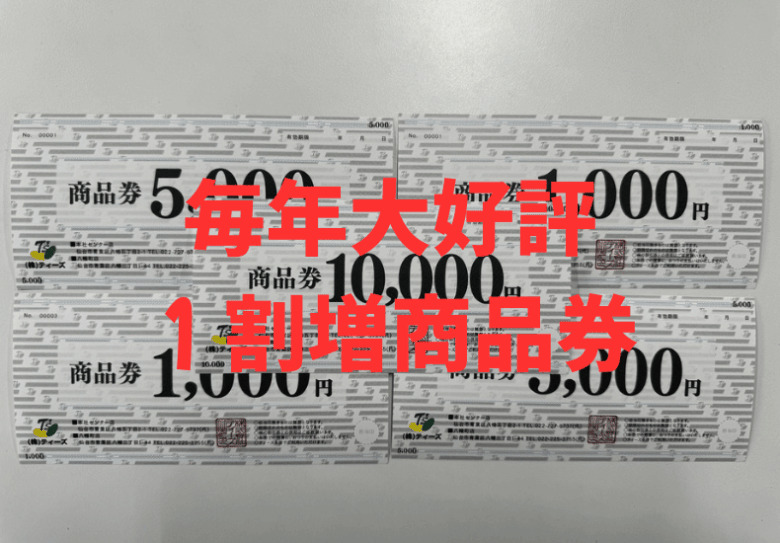 1万円分を購入すれば「11,000円分」5万円分を購入すれば『55,000円分』10万円分では『110,000円分』と超お得な商品券です。
