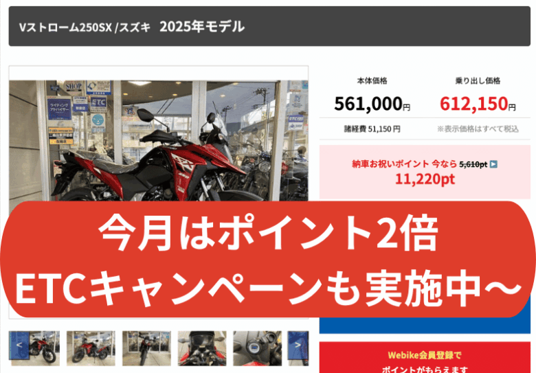 期間中に、2023年~2025年モデルのSUZUKI・Vストローム250SXの新車(国内認定車)をご購入いただいたお客様へ、購入特典として「ETC2.0車載器セット(純正用品)」をセット価格より15,910円(税込み)を割引しちゃいます〜キャンペーン