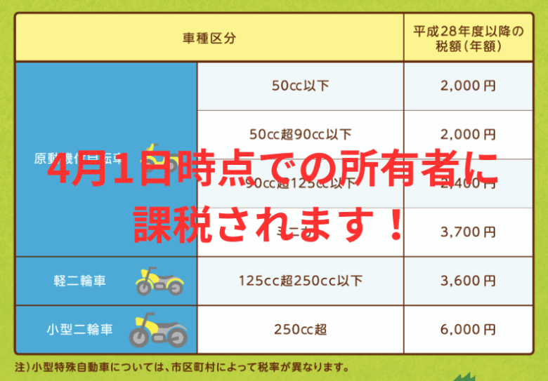 友達へ譲るとか、乗らなくなったスクーターやバイクを名義変更や抹消登録をしないと、軽自動車税が課税されますので、お気をつけ下さい。