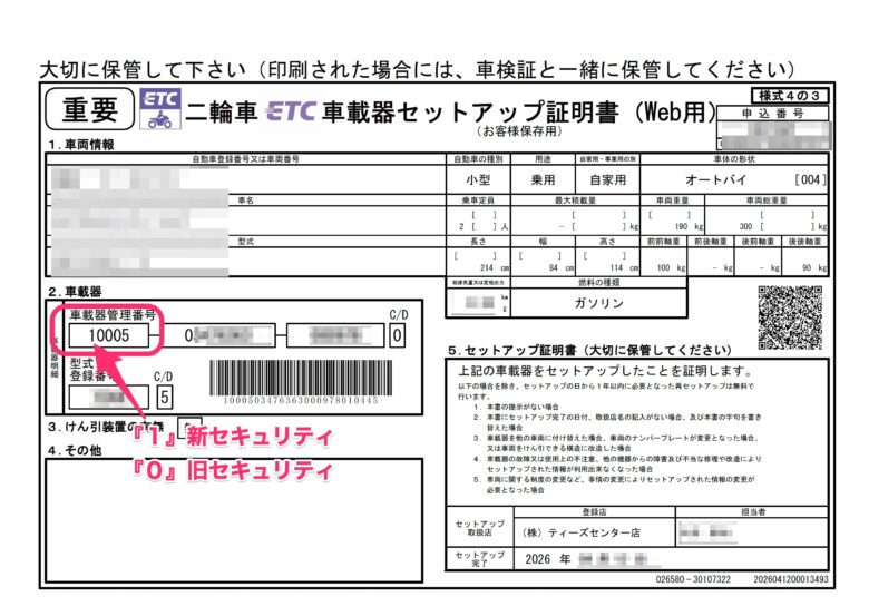 管理番号は取り付け時に受け取った「二輪車ETC車載器セットアップ証明書」で確認することができます(上記)