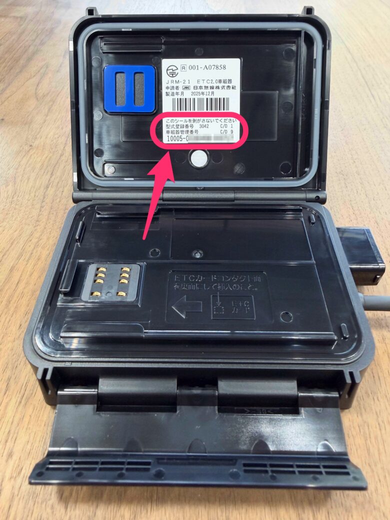 または、車載器本体の裏側カード挿入口フタの中などに管理番号が記載されておりますので確認することが可能です。